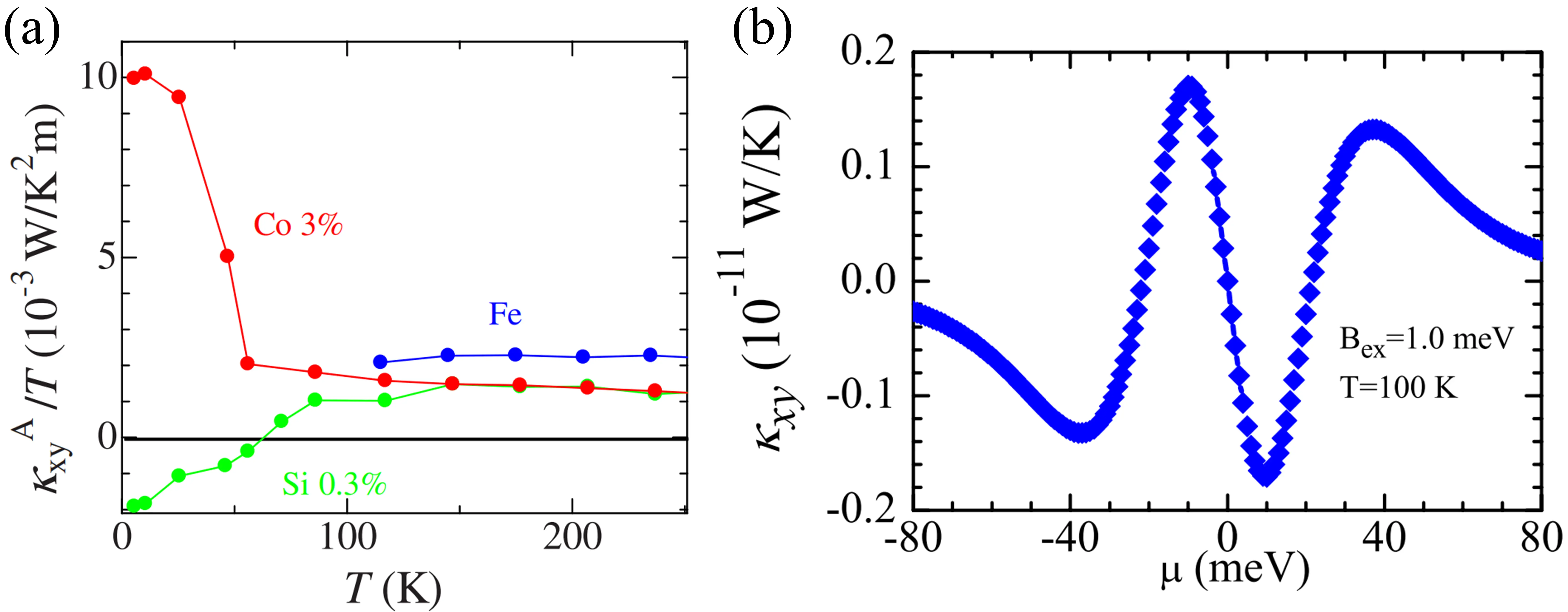 Figure 2. (a) Pure and doped iron: The anomalous part of the thermal Hall conductivity (κAxy/T). Republished with permission from[73]; (b) Thermal Hall conductivity κxy of silicene as a function of chemical potential μ under the effective field Bex = 1 meV. T = 100 K and ∆z = 0. Republished with permission from[77].