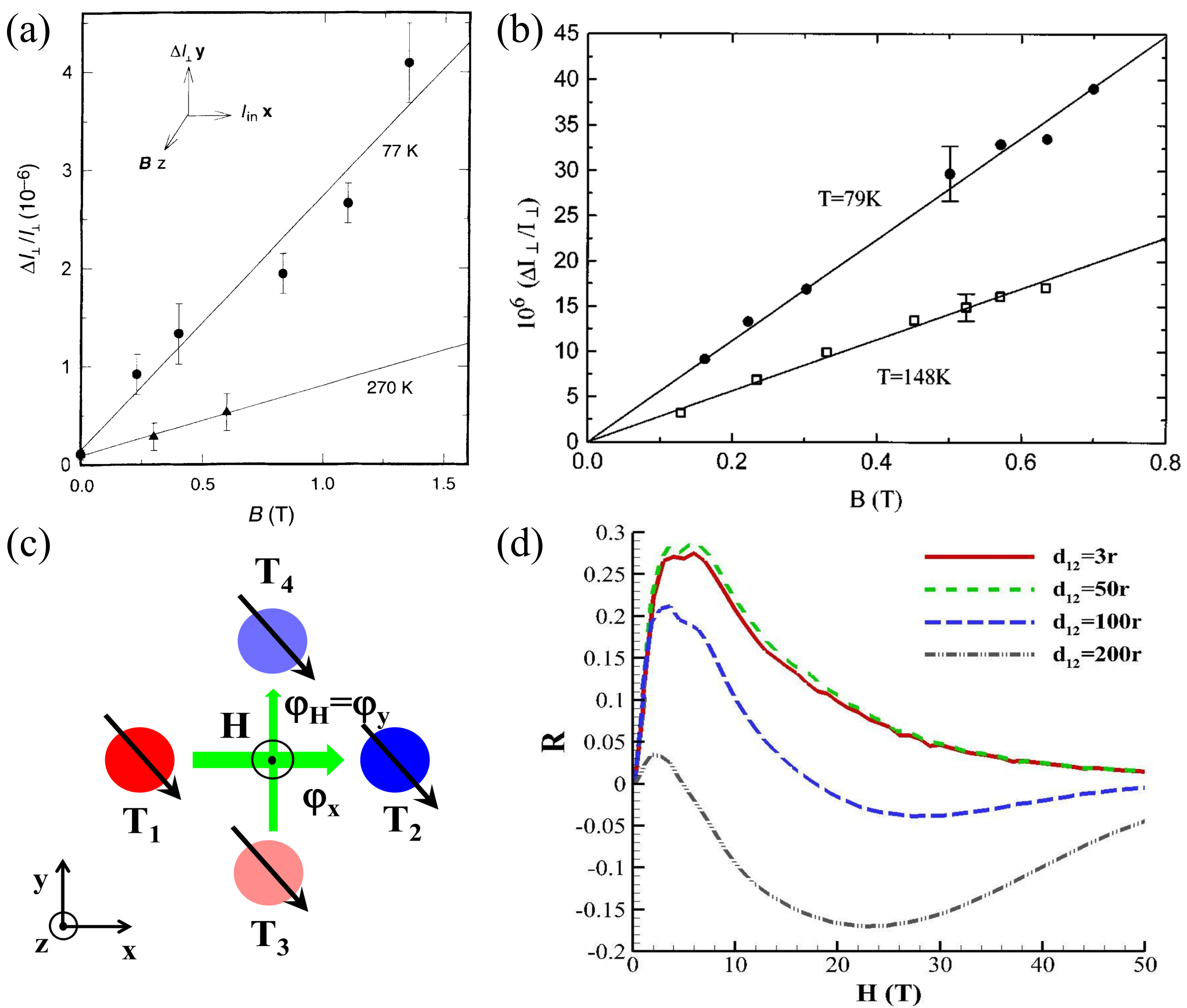 Figure 3. (a) Relationship between the normalized transverse magneto-optical current ∆I⊥/I⊥ and magnetic field amplitude B at different temperatures for CeF3. Republished with permission from[85]; (b) Relationship between the normalized transverse magneto-optical current ∆I⊥/I⊥ and magnetic field amplitude B for the sample under test at different temperatures. Republished with permission from[86]; (c) Photon thermal Hall effect; (d) Relationship between the relative Hall temperature difference R and magnetic field H at Teq = 300 K for different separation distances. Republished with permission from[96].