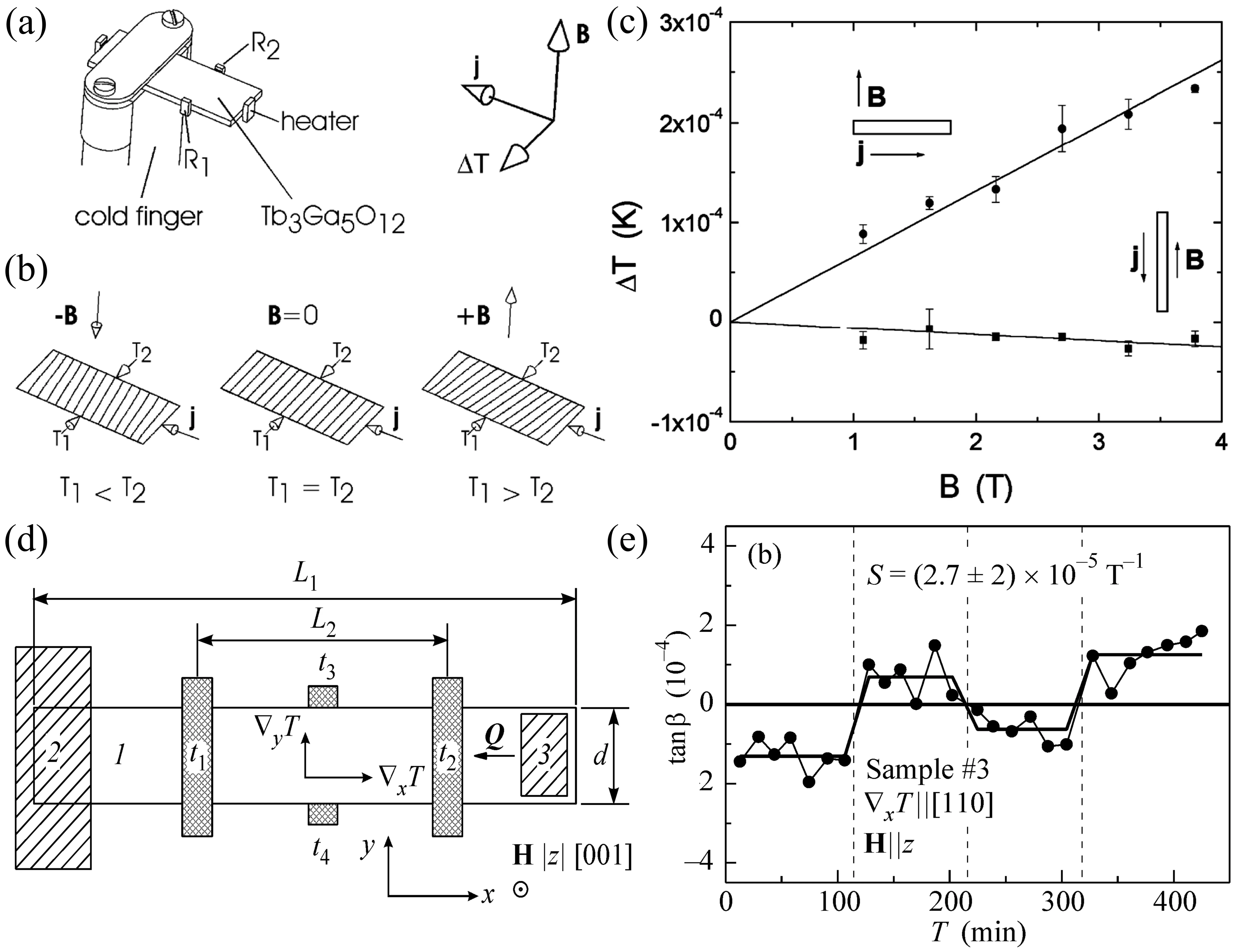 Figure 4. (a) Schematic diagram of the experimental setup; (b) Isothermal lines of the sample under magnetic field and zero magnetic field; (c) Transverse temperature difference of heat flow in Tb3Ga5O12 when the magnetic field is perpendicular (circle) and parallel (square). Republished with permission from[99]; (d) Layout of the experimental setup and the direction of the heat flux in the sample; (e) Tangent of the Hall angle as the applied magnetic field (H = ±3T) changes direction. The symbol S denotes the coefficient of the phonon Hall effect. The vertical dashed lines correspond to the time when the magnetic field sign changes. Republished with permission