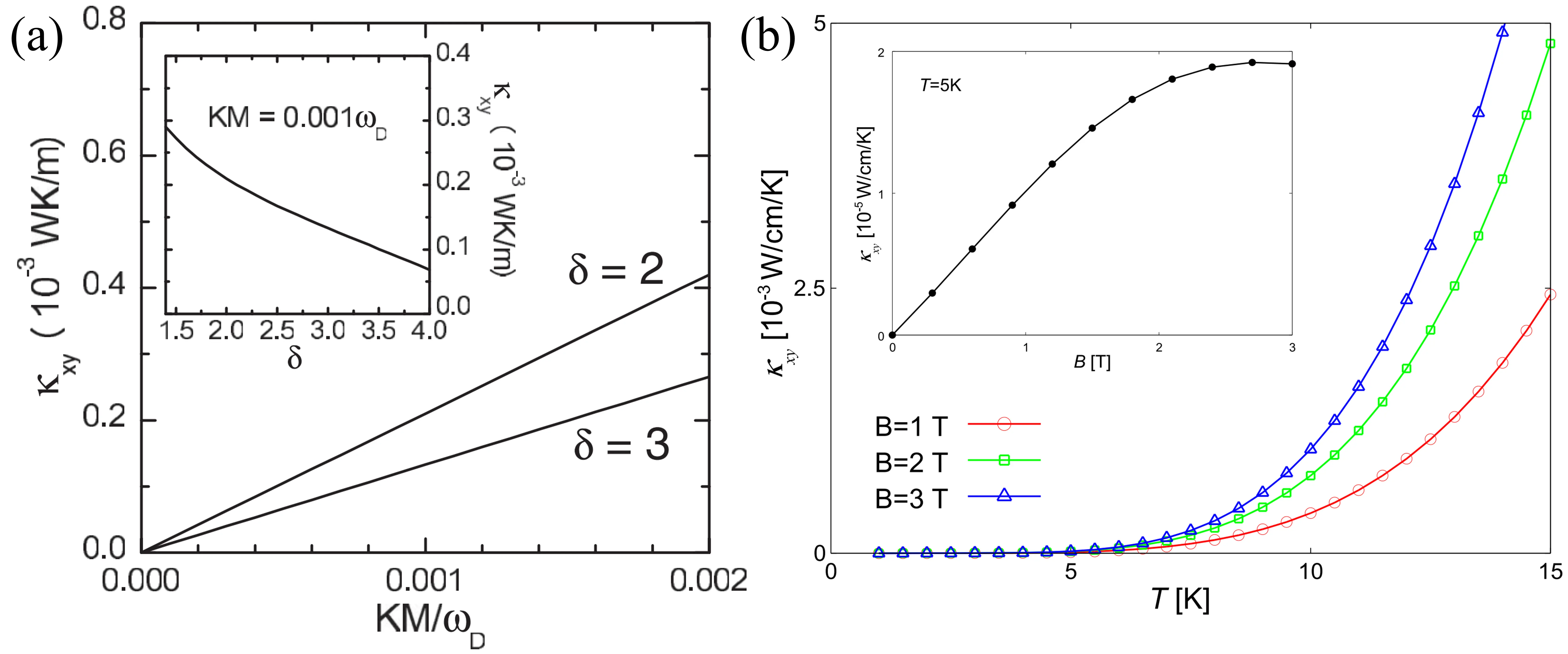 Figure 5. (a) The functional relationship between the thermal Hall conductivity κxy and KM/ωᴅ for different δ values. Republished with permission from[36]; (b) Magnetic field dependence of the thermal Hall conductivity κxy [10-5 W/cm/K]. The inset shows the magnetic field dependence of κxy [10-5 W/cm/K] at T = 5 K. Republished with permission from[102].