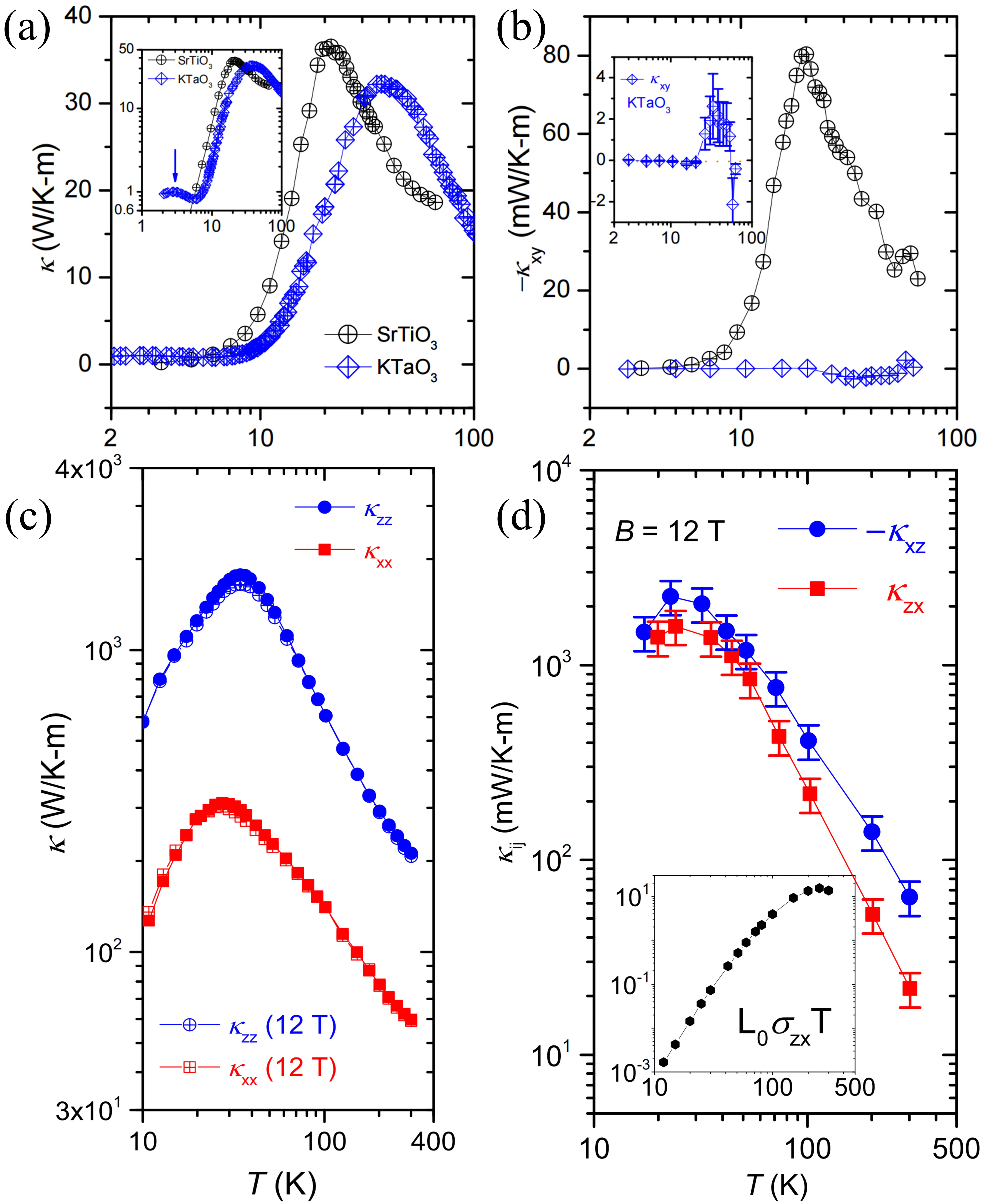 Figure 6. (a) Longitudinal thermal conductivity κ of SrTiO3 and KTaO3, with the inset showing a logarithmic plot; (b) thermal Hall conductivity κxy of SrTiO3 and KTaO3, with the inset showing an enlarged signal for KTaO3. Republished with permission from[40]; (c) Transverse thermal conductivity κ of BP in different directions; (d) Thermal Hall conductivity κzx and κxz of BP. Republished with permission from[105]. The horizontal axes in the figures all represent the absolute temperature T (K).