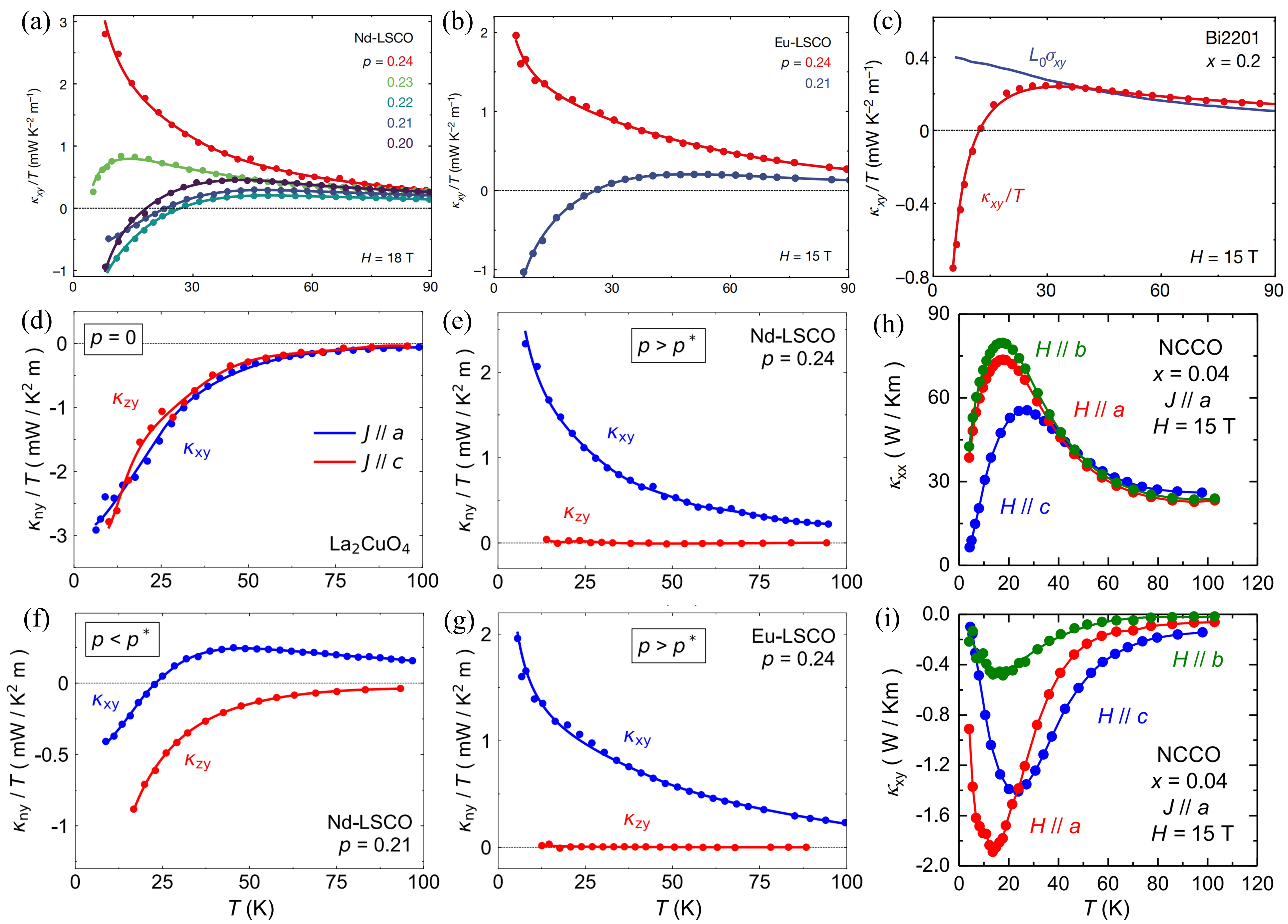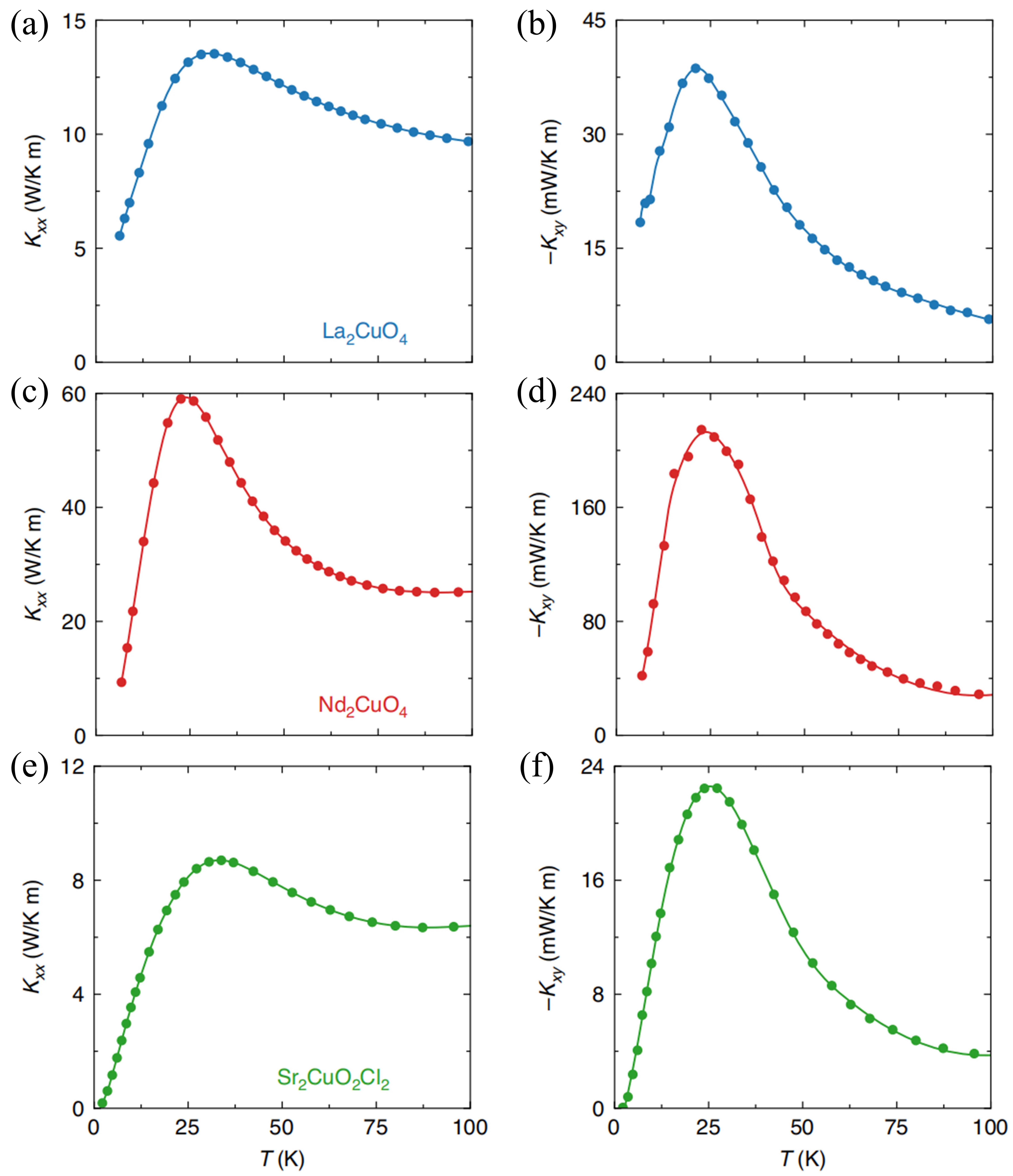Boulanger et al.[118] studied two other cuprate Mott insulators, Nd2CuO4 and Sr2CuO2Cl2, and found that they exhibit a similar negative κxy as La2CuO4, with results shown in Figure 8a,b,c,d,e,f. The trend of -κxy and κxx as a function of temperature is similar, both reaching a peak at approximately T ≈ 25 K. At T = 20 K, the magnitude of κxx in Nd2CuO4 is eight times that in Sr2CuO2Cl2, and correspondingly, |κxy| increases by a factor of 10. This provides strong evidence for phonons as the thermal transport carriers.