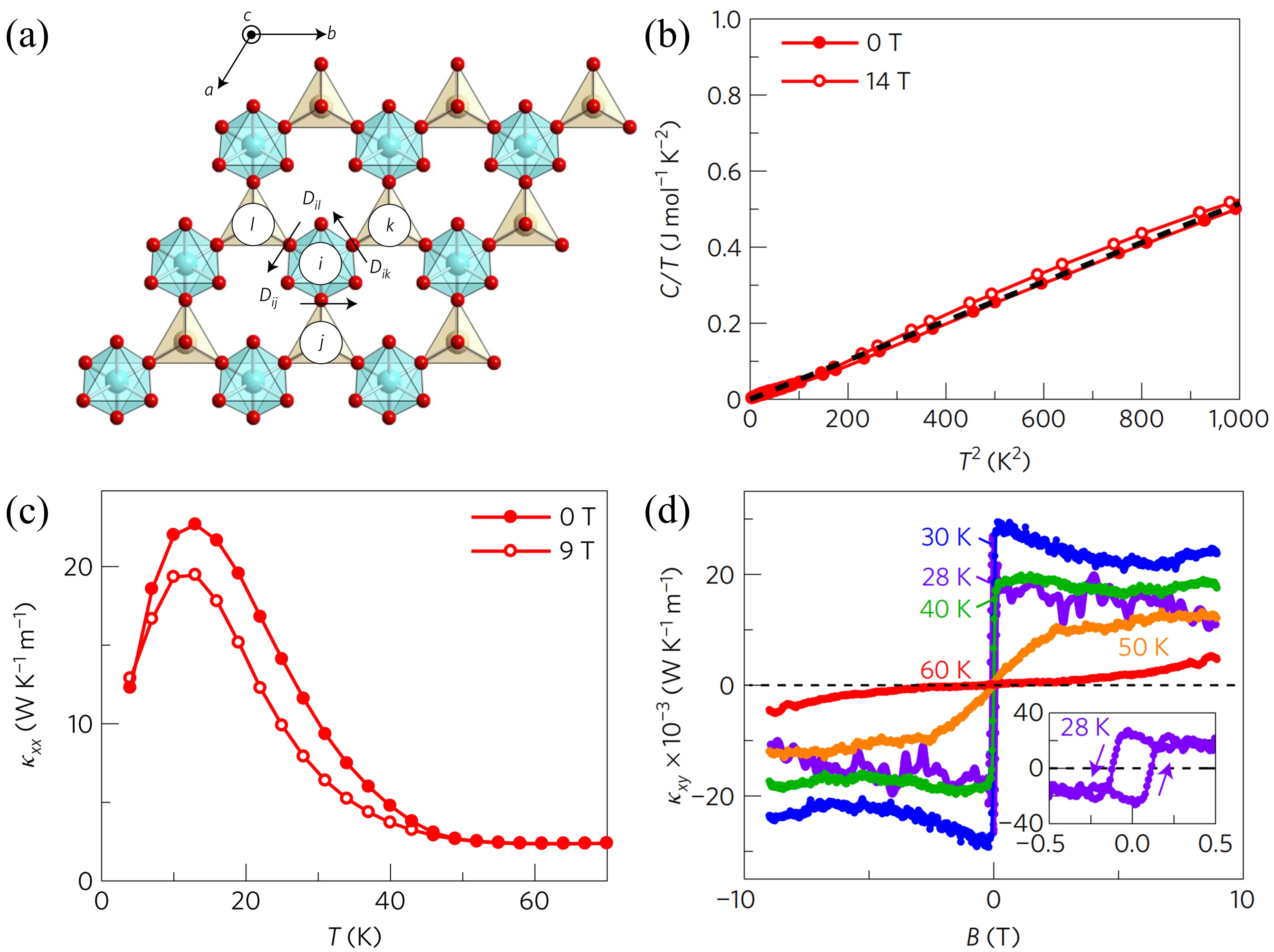 Figure 9. Crystal structure and thermal magnetic properties of (ZnxFe1-x)2Mo3O8. (a) Crystal structure, with black arrows representing the DM vectors; (b) Temperature dependence of the specific heat; (c) Temperature dependence of the longitudinal thermal conductivity κxx; (d) Magnetic field dependence of the thermal Hall conductivity κxy. Republished with permission from[38]. DM: Dzyaloshinskii-Moriya.
