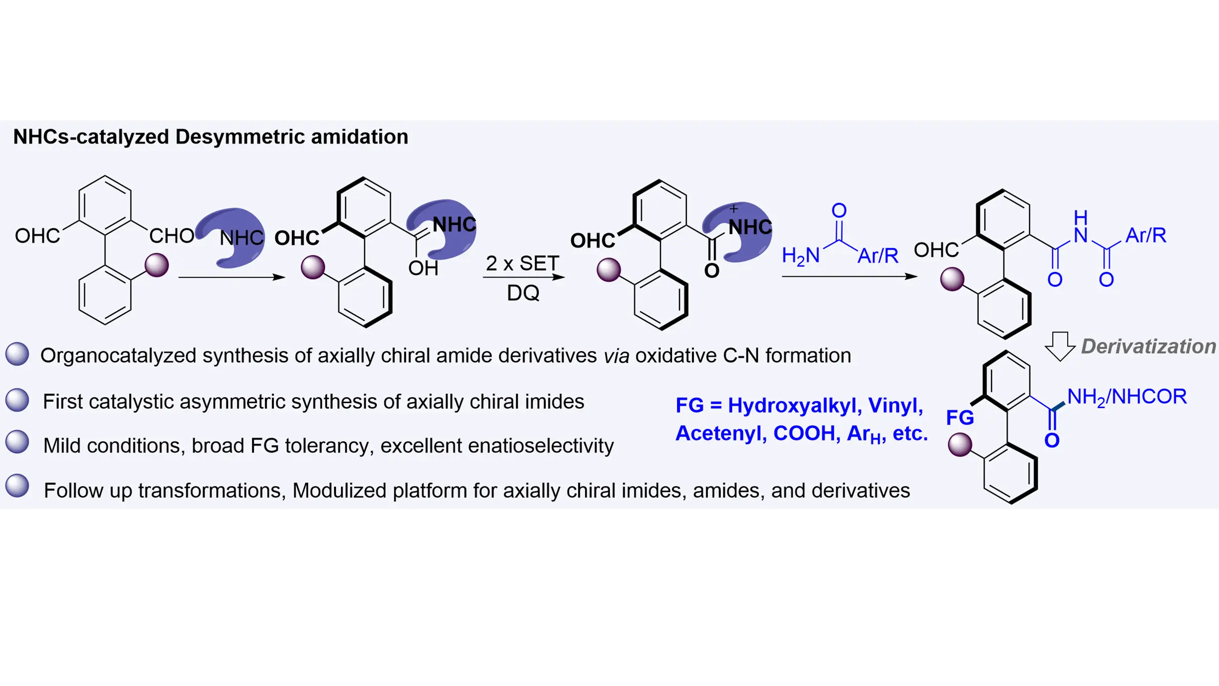 MoreThe synthesis of biaryl axially chiral amides and their derivatives—compounds that have shown promise as additives or catalysts in asymmetric catalysis—has traditionally relied on transition-metal catalysts. Herein, we report an NHC-catalyzed organocatalytic atropoenantioselective amidation between axially prochiral biaryl dialdehydes and amides that efficiently affords axially chiral imides. This method operates under metal-free and mild conditions, exhibits broad functional group tolerance and substrate scope, and delivers products with excellent enantioselectivities. Furthermore, a wide variety of axially chiral imides, amides, and related derivatives can be accessed through enantio-retentive transformations, offering a versatile and attractive strategy for their synthesis.
