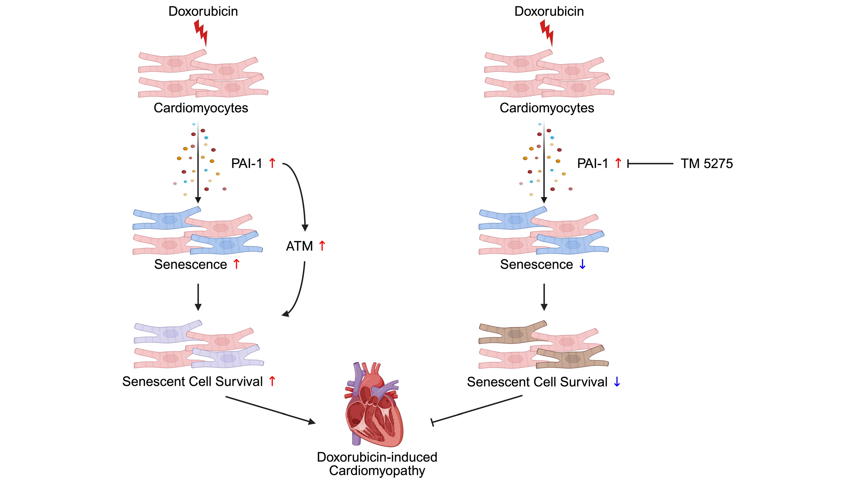 Results: PAI-1 was identified as a major component of the senescence-associated secretory phenotype and was robustly upregulated in Dox-treated cardiomyocytes. In NRVMs, PAI-1 promoted senescence and maintained the senescent phenotype, in part by conferring resistance to apoptosis. Pharmacological inhibition of PAI-1 reduced senescence markers, enhanced apoptotic responses, and preserved cardiac structure and function in Dox-treated mice. Fate mapping analyses with p21High-tdTomato mice revealed that PAI-1 inhibition decreased the number of p21High senescent cardiomyocytes in Dox-treated hearts. Notably, PAI-1 inhibition did not attenuate Dox cytotoxicity in EO771 murine breast cancer cells.