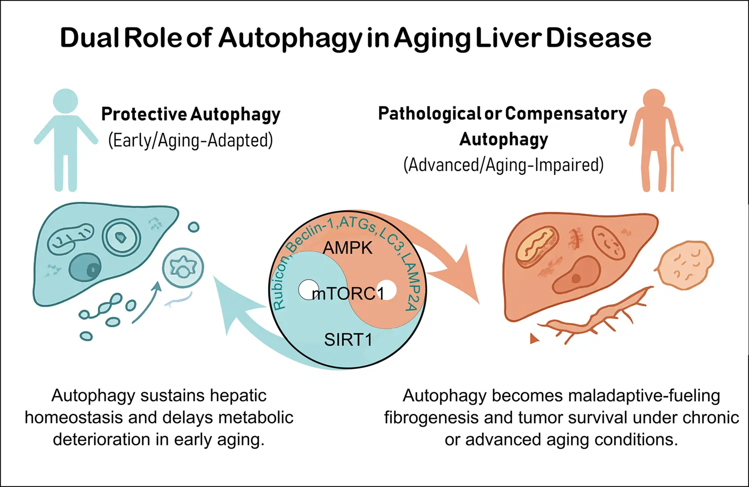 Aging profoundly impacts liver physiology by disrupting autophagy, a lysosome-dependent degradation pathway essential for maintaining cellular homeostasis. Autophagy declines with aging due to reduced expression of core autophagy-related (ATG) genes/proteins, defective autophagosome fusion, and impaired selective processes such as lipophagy, mitophagy, and chaperone-mediated autophagy. These alterations contribute to lipid accumulation, oxidative stress, inflammation, and mitochondrial dysfunction, thereby accelerating age-related liver diseases including metabolic-associated fatty liver disease (MAFLD), fibrosis, and hepatocellular carcinoma (HCC). Their molecular mechanisms involve deregulation of nutrient-sensing pathways (mTOR complex 1, AMP-activated protein kinase and sirtuin 1 and 3) and context-dependent roles of autophagy-related proteins (ATG5, ATG7, LC3, Beclin-1, LAMP2A). Importantly, the regulatory role of autophagy differs across disease stages related to liver aging. During early phases, it maintains metabolic balance, mitochondrial quality control, and genomic stability in some diseases such as MAFLD and liver fibrosis. Conversely, in advanced disease, particularly in HCC, persistent autophagy supports tumor cell survival, stemness, and immune evasion. Emerging therapies seek to restore autophagic flux through caloric restriction, physical exercise, caloric restriction mimetics (rapalogs, spermidine, metformin), and pharmacological modulators such as Tat-BECLIN-1 peptides or RUBICON-targeted approaches. However, translating these therapies into clinical practice remains challenging due to systemic effects, stage-specific responses, and lack of reliable non-invasive biomarkers for monitoring autophagy in humans. Advances in nanoparticle-based delivery, biomarker-guided stratification, and combination therapies with tyrosine kinase inhibitors or immune checkpoint inhibitors may offer promising strategies. Overall, precision modulation of autophagy could serve as a potent geroprotective approach to preserve liver function, delay age-related metabolic deterioration, and prevent progression to fibrosis and cancer. Achieving this goal requires considering disease stage, systemic interactions, and autophagy’s context-dependent duality in aging when implementing these strategies.